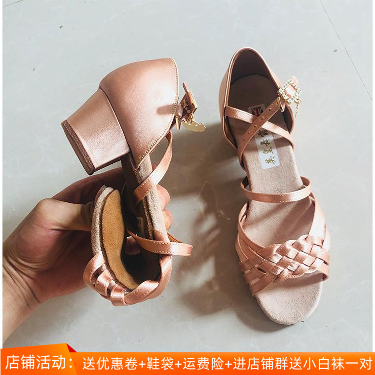 柔软舒适】儿童纯手工镶钻拉丁舞鞋舞蹈鞋粗跟拉丁鞋带钻少儿女童