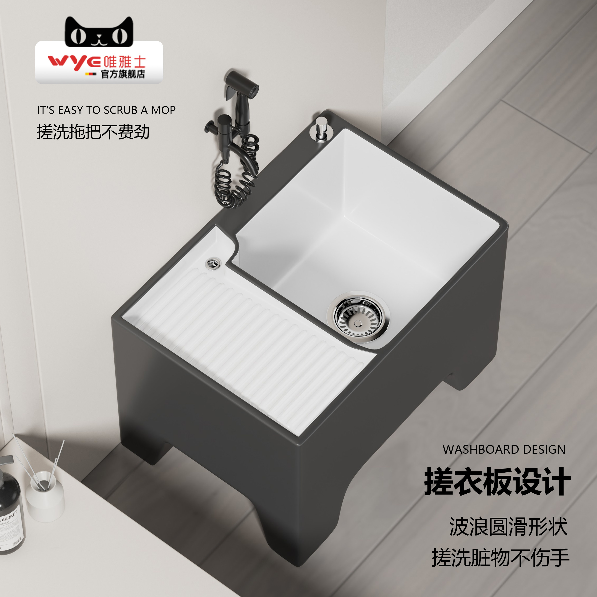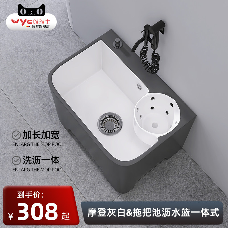 唯雅士北欧灰色家用陶瓷拖把池带沥水篮拖布池新款阳台户外墩布池