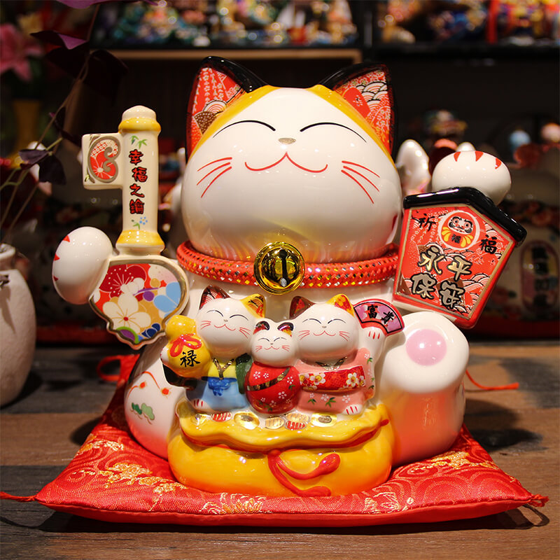 日本药师窑财源广进招财猫套装陶瓷摆件生日开业装饰创意礼品车载
