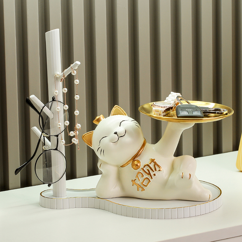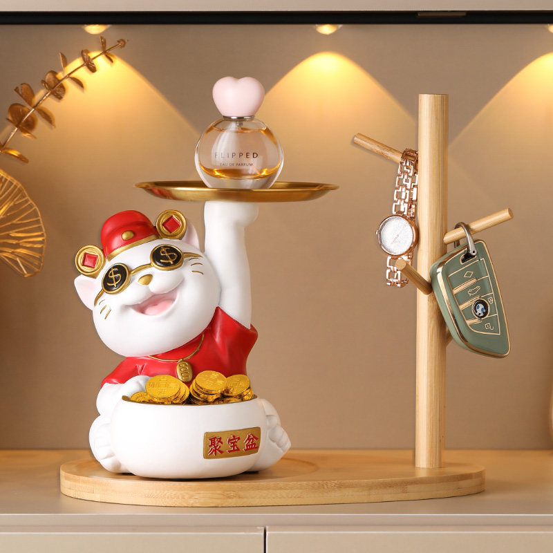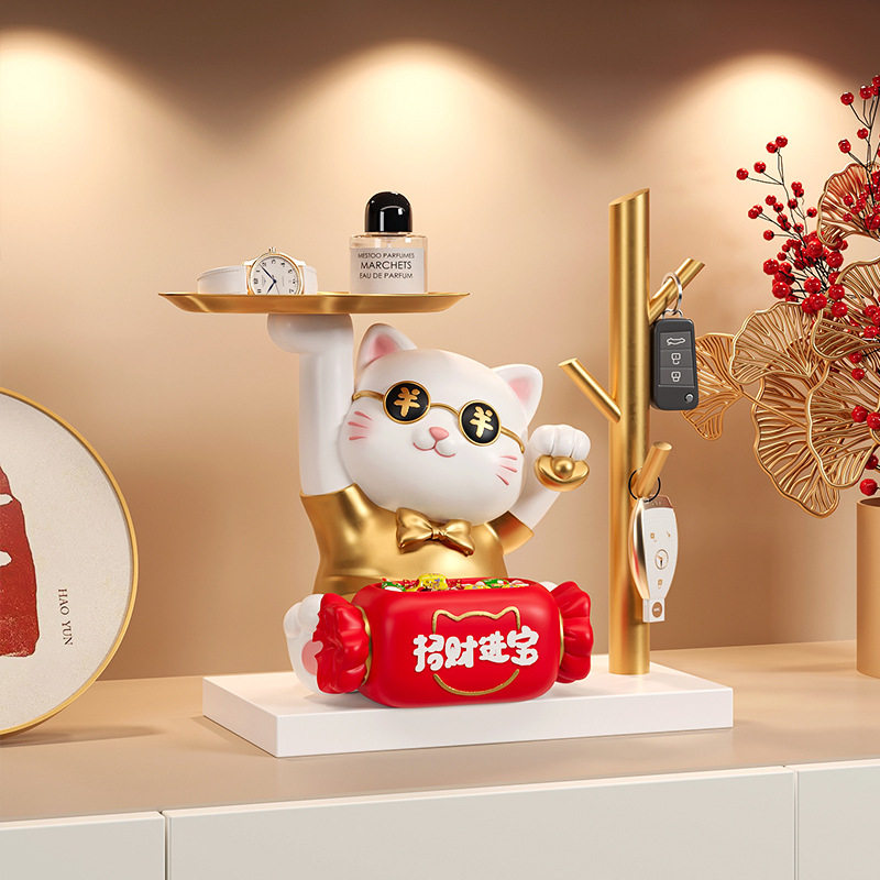 创意招财猫入户玄关钥匙收纳摆件客厅开业托盘装饰品乔迁新居礼品