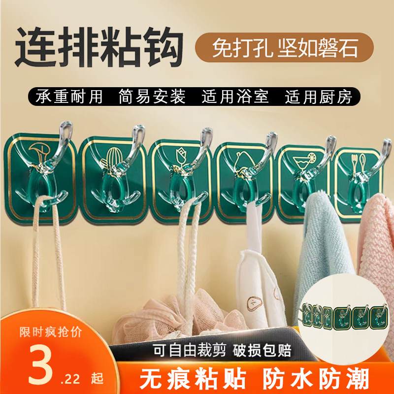 强力连排挂钩免打孔卫生间无痕钉架收纳壁挂粘钩浴室不掉落挂衣钩
