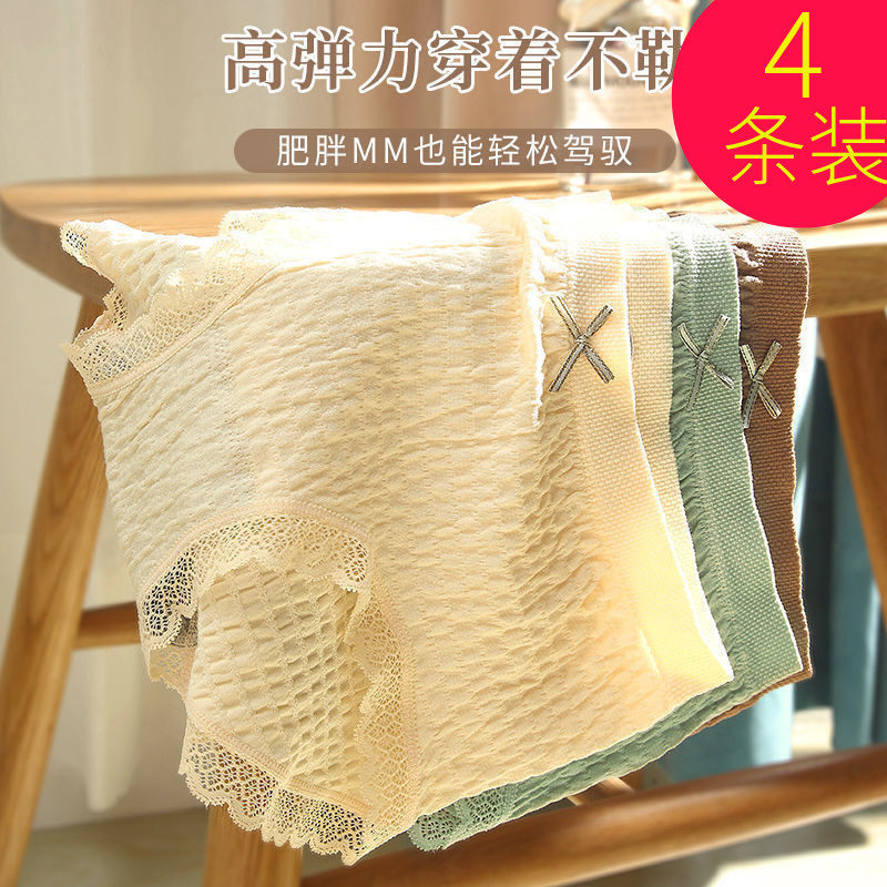 大码内裤女纯棉蕾丝抗菌舒适100%全棉高腰收腹提臀透气女士三角裤