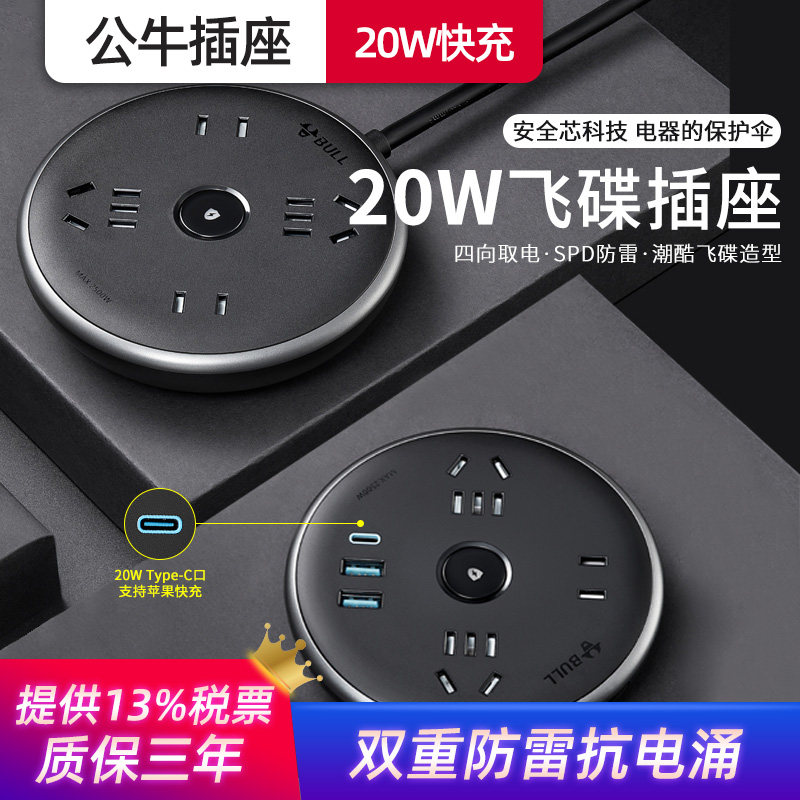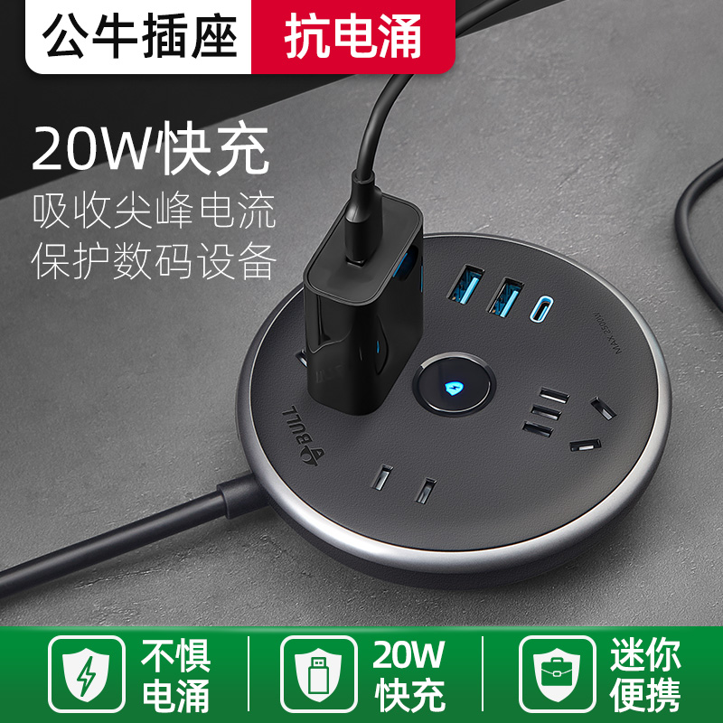 公牛抗电涌飞碟插座USB快充圆盘防雷多功能家用多孔桌面插板插排