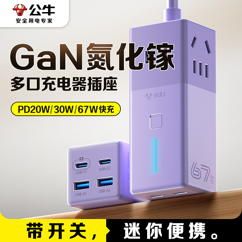 公牛氮化镓插座PD20w30w67w安全快充小电舱排插充电usb插排接线板
