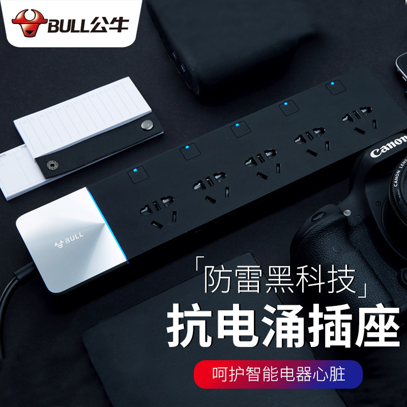 公牛抗电涌插座面板多孔防雷黑色USB接线插线板排插电插排查带线