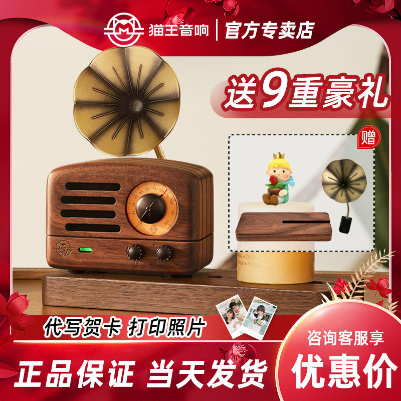 猫王音响猫王小王子无线蓝牙小音箱复古手工原木收音机情人节礼物