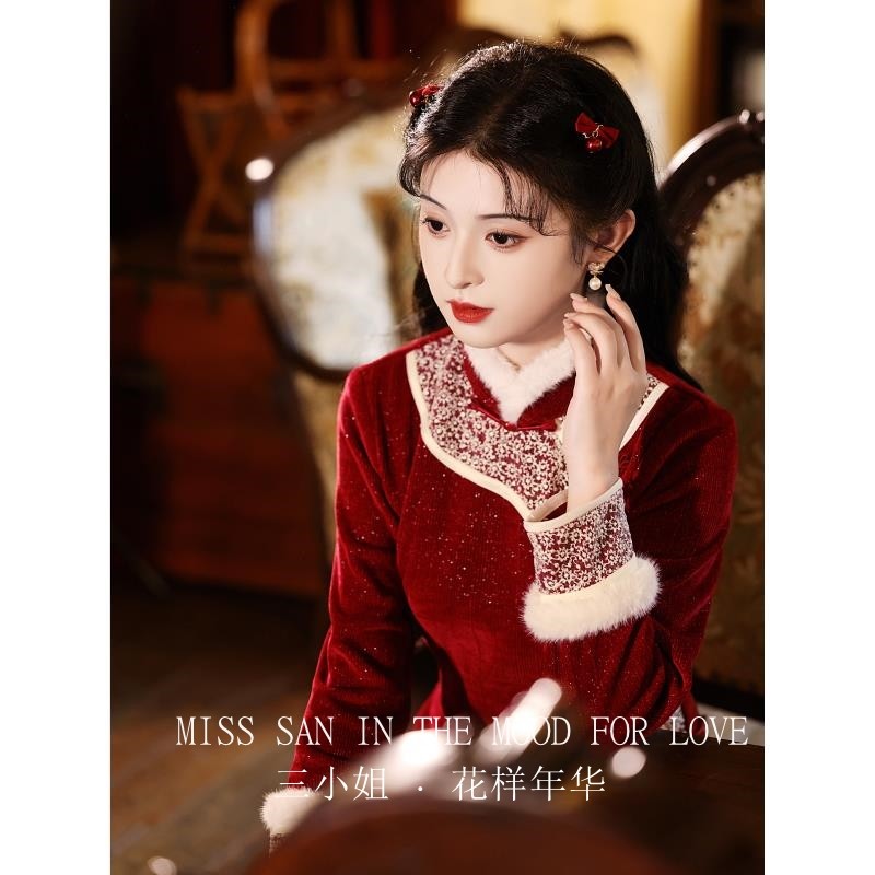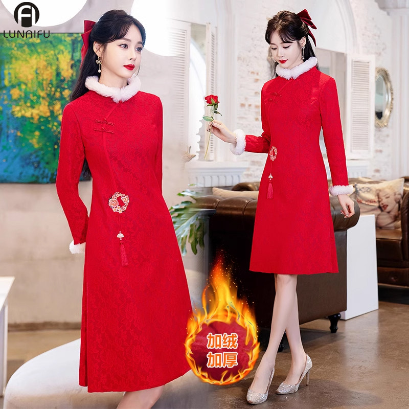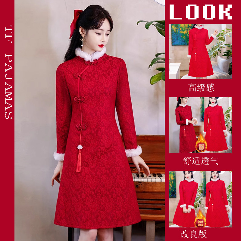 新中式龙年拜年旗袍红色新娘敬酒服秋冬季加绒加厚新年战袍民国裙