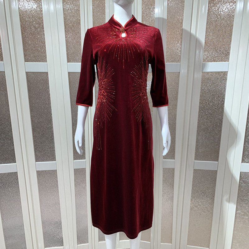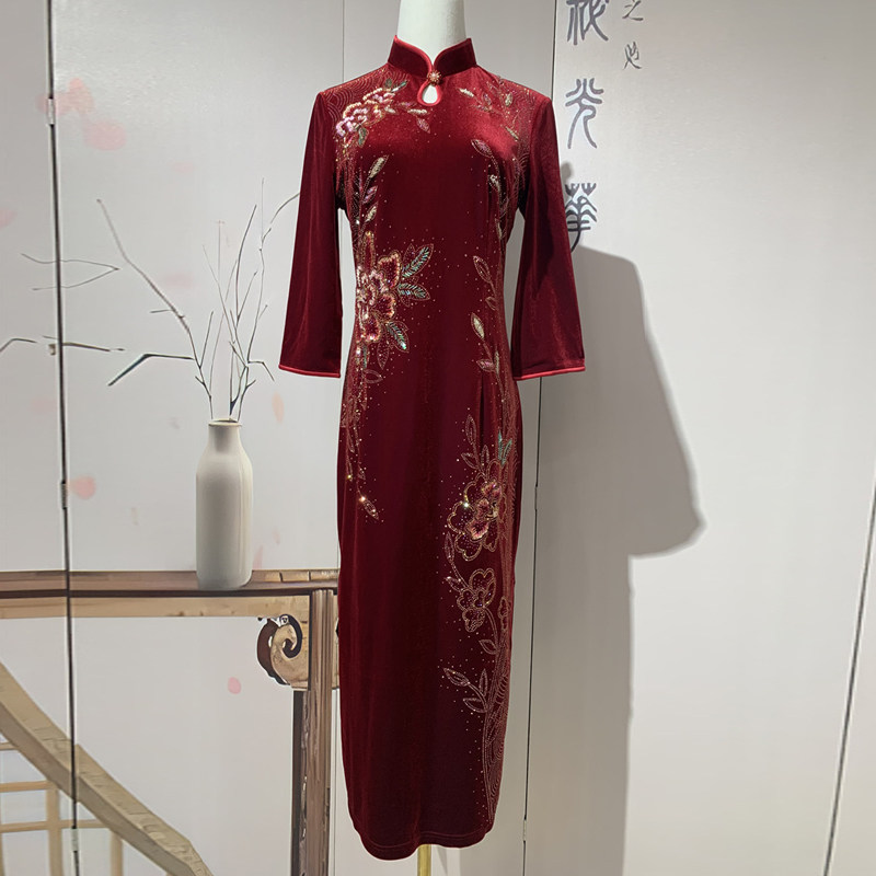 多丽琦复古改良旗袍丝绒刺绣晚礼服高档婚礼喜妈妈敬酒服连衣裙女