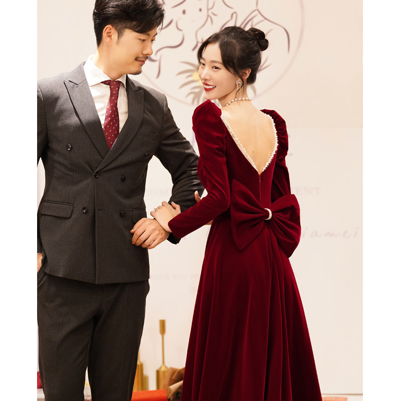 丝绒敬酒服新娘酒红色结婚订婚回门礼服裙女高级感法式长袖秋冬季