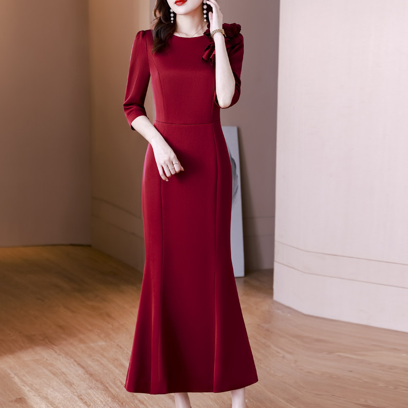 礼服长袖2023春夏款酒红色敬酒服丝绒长款结婚聚会礼仪年会主持女