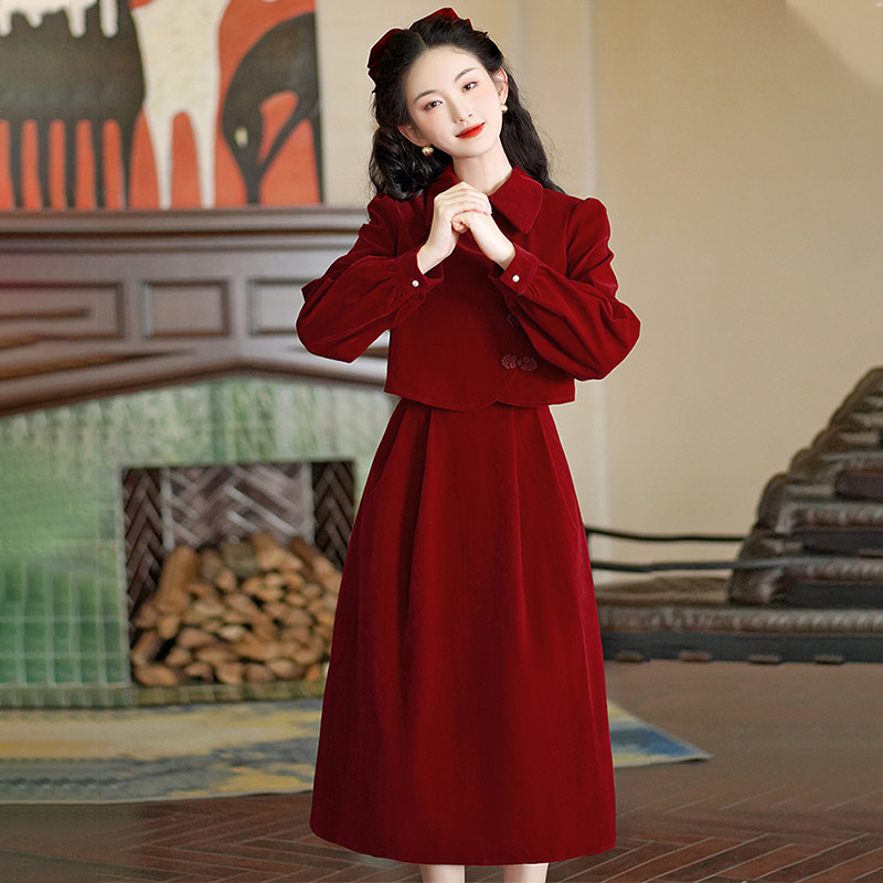 法式复古赫本风红色丝绒假两件连衣裙气质礼服回门敬酒服新娘秋装
