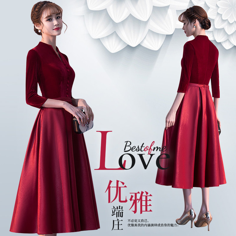 时尚晚礼服中长裙女气质优雅生日派对新娘敬酒服宴会小礼服连衣裙