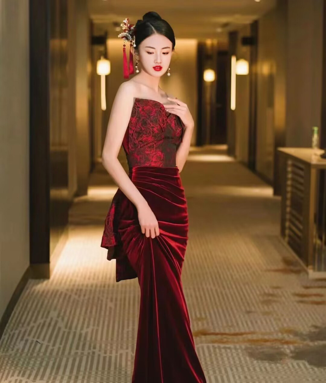 酒红色复古新中式抹胸晨袍女新娘结婚敬酒服小众晚礼服高级感小众