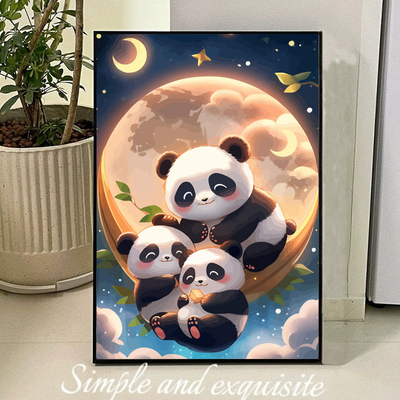 熊猫花花一家人DIY数字油画儿童手工绘填充涂色丙烯油彩装饰挂画