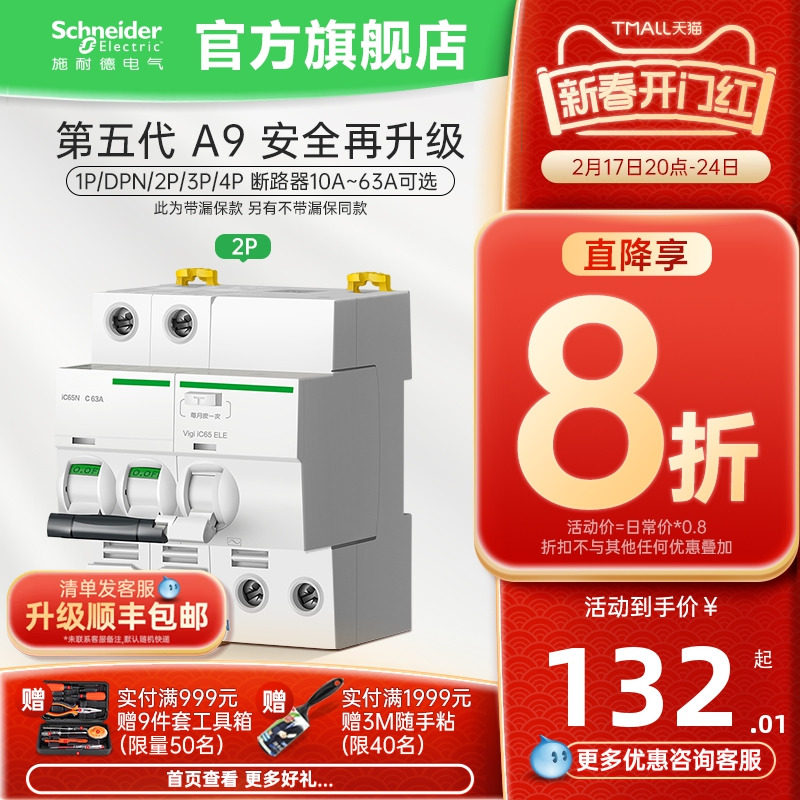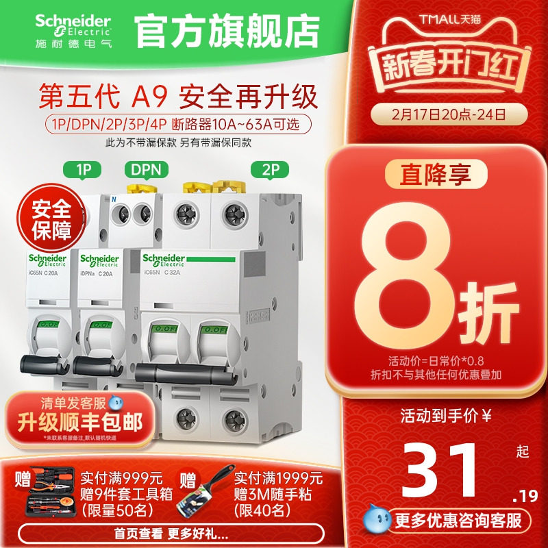 施耐德断路器E9空气开关家用2P空开63A漏电保护1P+N 20A原装正品