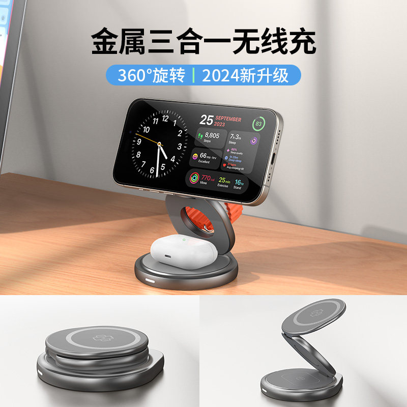 冠渠适用苹果15三合一无线充电器Magsafe磁吸iPhone14Pro金属折叠手机支架耳机apple watch手表充电座AirPods