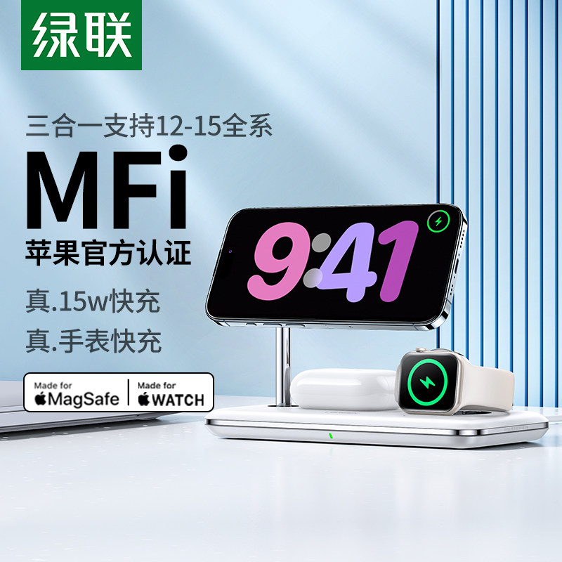 绿联三合一无线充电器MFi认证适用苹果15手机iwatch手表iPhone14promax13耳机magsafe磁吸MFM15W快充支架底座