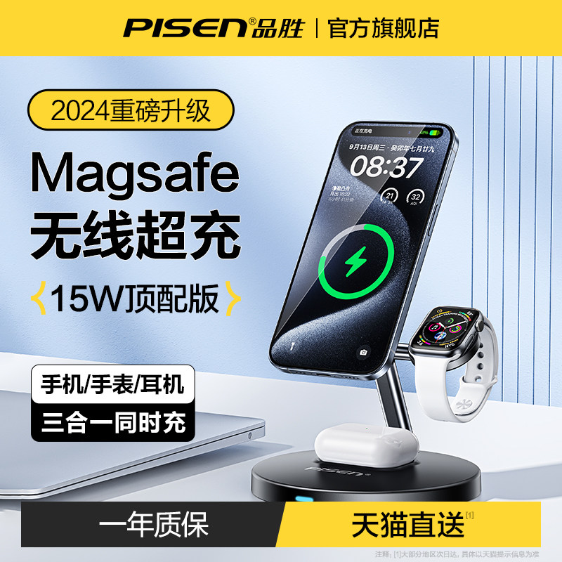 品胜三合一无线充电器适用苹果15快充底座Magsafe磁吸iPhone14手机充电座iWatchS9手表支架airpods耳机Ultra