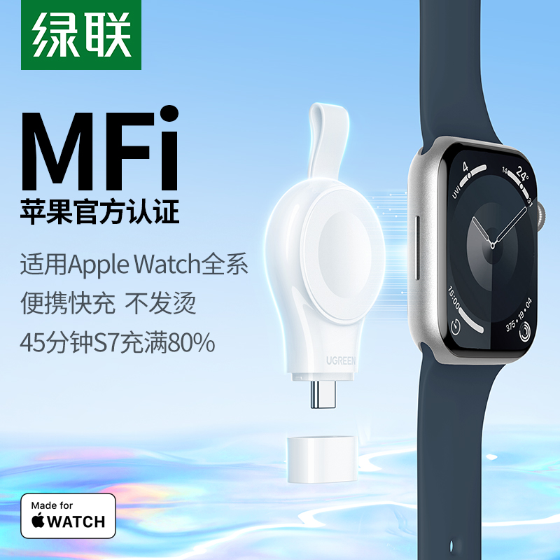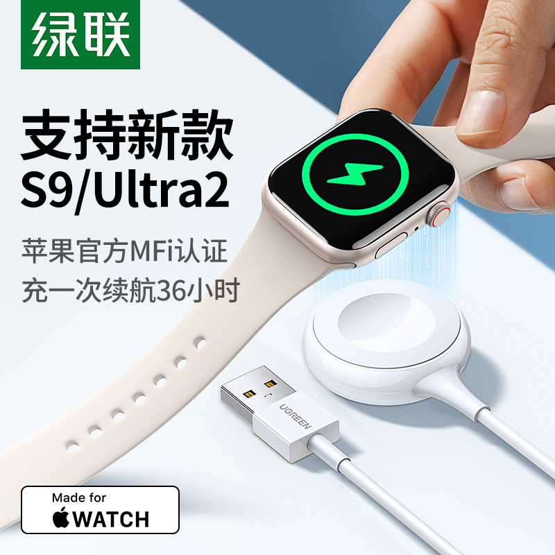 绿联适用于苹果applewatchS9手表充电器iwatch8mfi认证6充电线3头series7SE1代便携5磁吸ultra2快充4无线底座