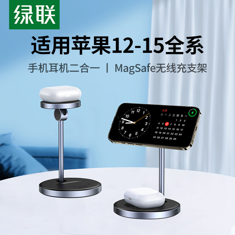 绿联magsafe磁吸无线充电器适用于苹果15手机iPhone14pro13max12桌面耳机20w快充配件通用立式二合一底座支架