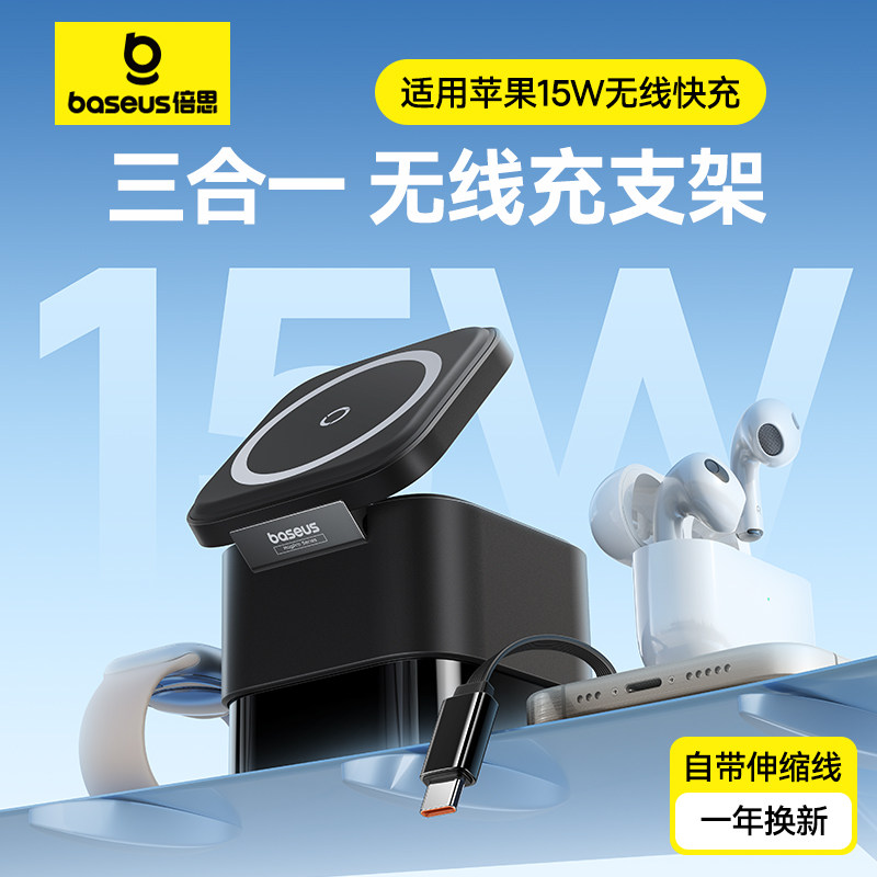 倍思25W三合一无线充电器15W磁吸支架适用15苹果14手机iWatch手表耳机magsafe无线充电底座AirPods立式