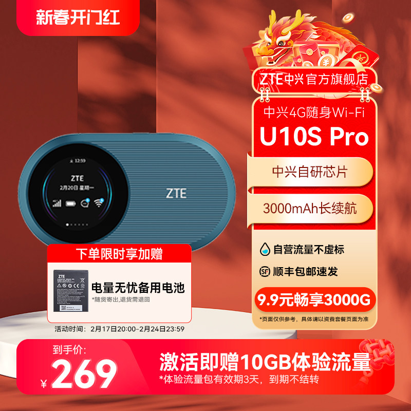 ZTE中兴U10S Pro随身wifi移动电信4G免插卡式3000mAh电池三网通路由器笔记本热点wifi6上网卡宽带中兴u10s