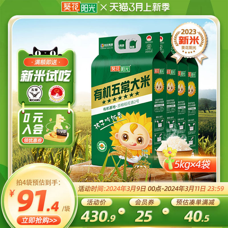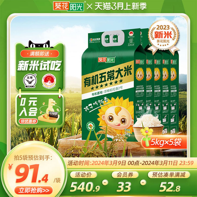 葵花阳光有机五常大米2023年新米5kg10斤东北大米GB/T19266