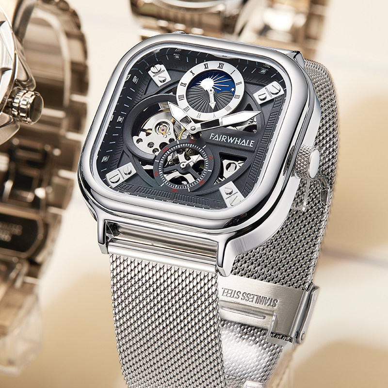 马克华菲2023新款方形陀飞轮潮流时尚机械男士镂空腕表夜光
