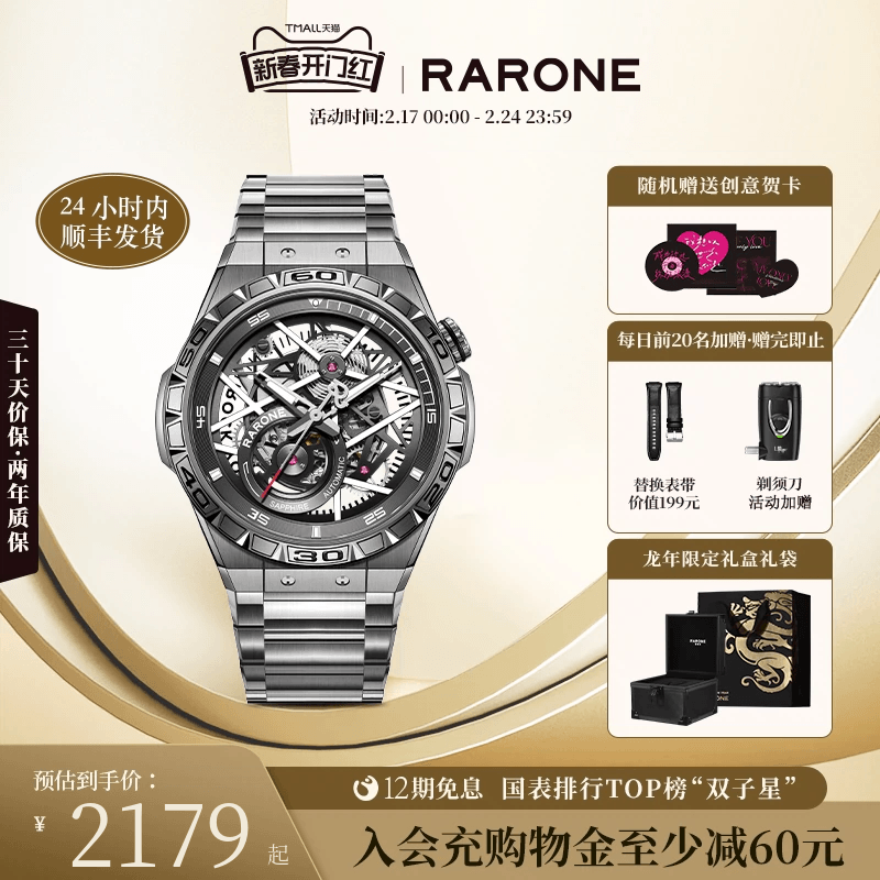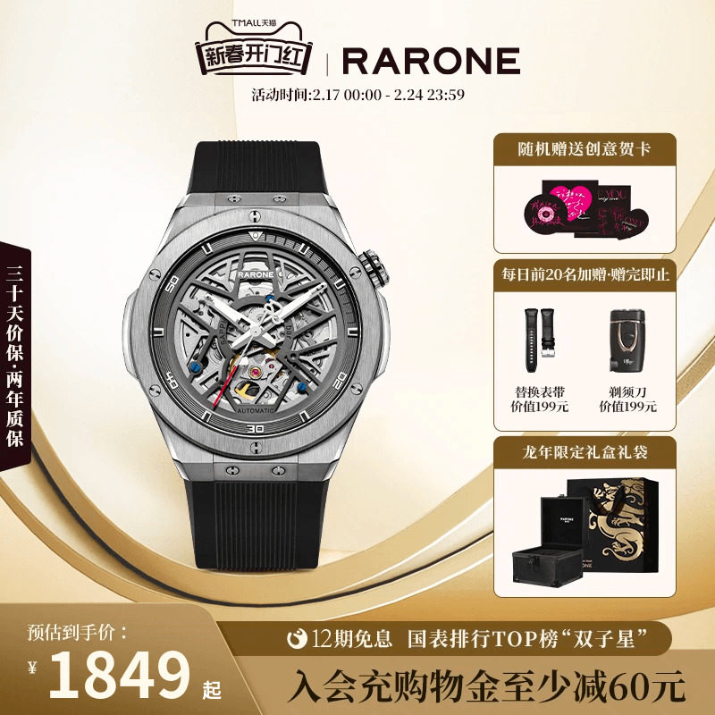 Rarone雷诺双子星系列Y镂空全自动夜光机械表防水手表男钢带送礼