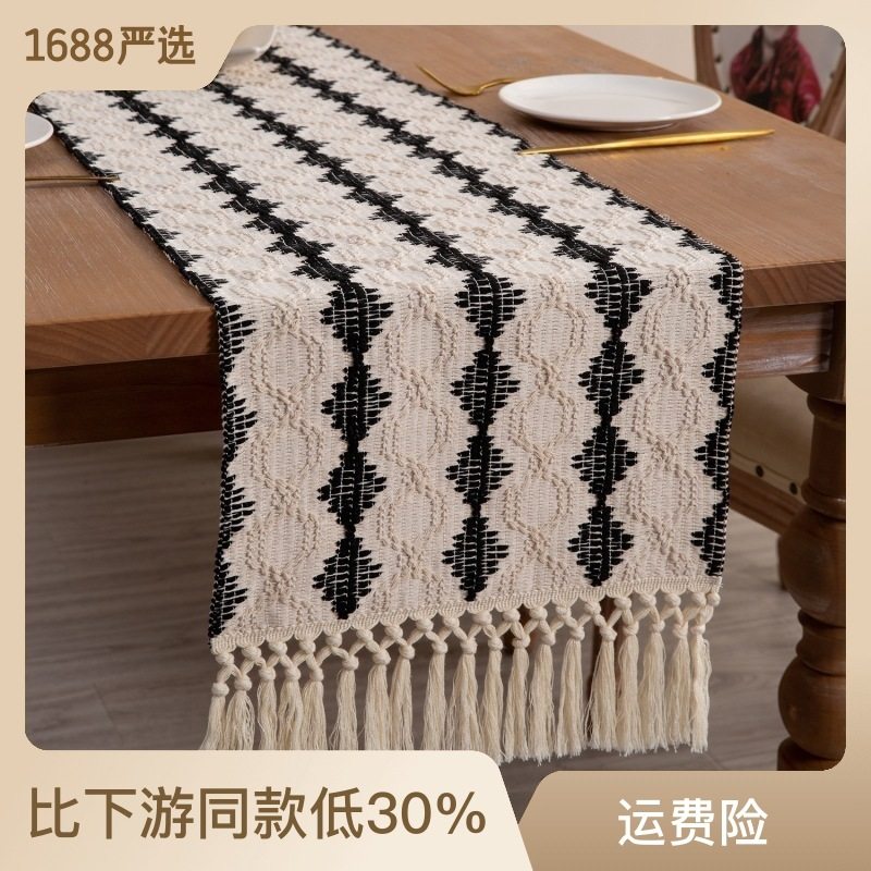 新款棉质编织桌旗流苏拼色节日装饰长条桌布鞋柜玄关柜盖布亚马逊