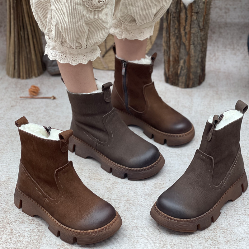 手工真皮纯羊毛加厚马丁靴女休闲短筒中跟靴子雪地靴短靴牛皮棉鞋
