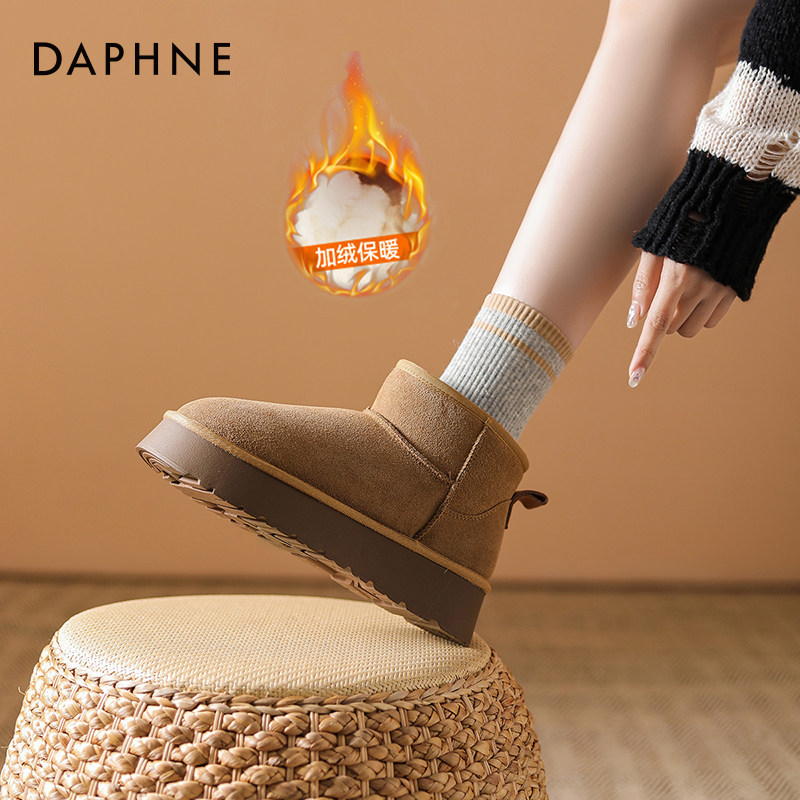 达芙妮加绒雪地靴女2023冬季加厚棉鞋保暖女鞋厚底中筒牛皮短靴子