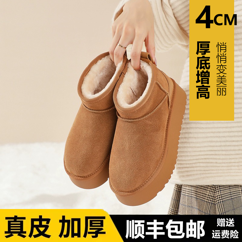 牛皮厚底雪地靴女款冬季加绒加厚短筒靴子女棉鞋一脚蹬毛毛拖鞋女