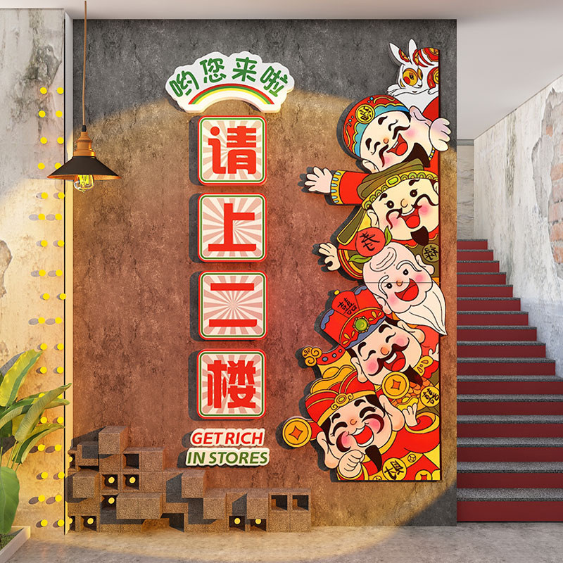 麻将馆装饰棋牌室新年布置艺网红公仔墙面摆件挂画楼梯扶手房贴纸