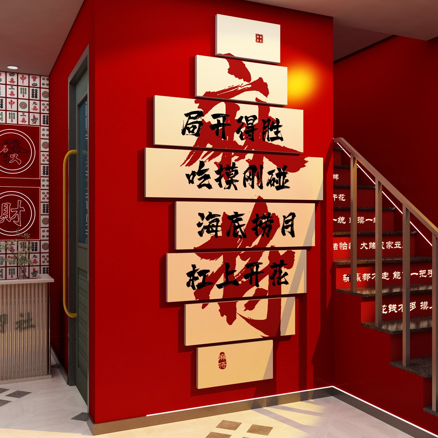 网红楼梯文化棋牌艺室墙面装饰品摆件麻将馆雀房背景布置挂画贴纸