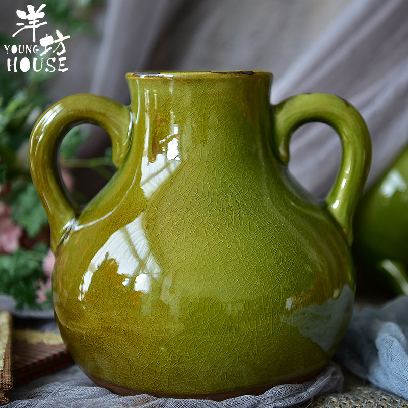 洋坊欧式陶瓷花瓶美式插花器客厅餐桌绿色双耳中式冰裂纹装饰摆件