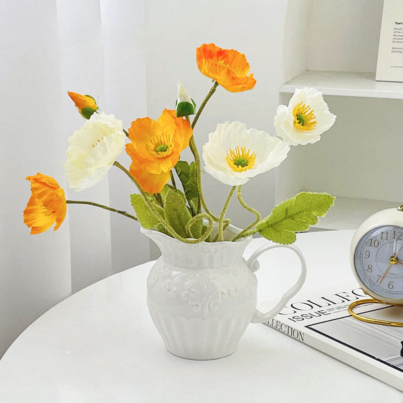 欧式ins风白色小奶壶复古浮雕陶瓷花瓶客厅插鲜花小众高级感摆件