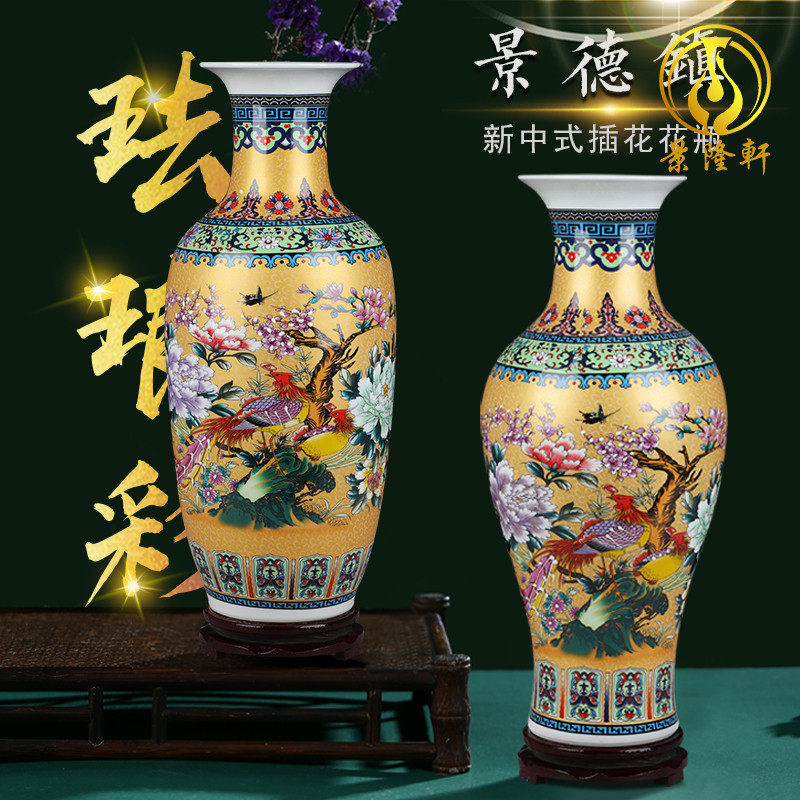 花瓶三件套景德镇陶瓷器中式摆件黄色孔雀欧式家居客厅酒柜装饰品