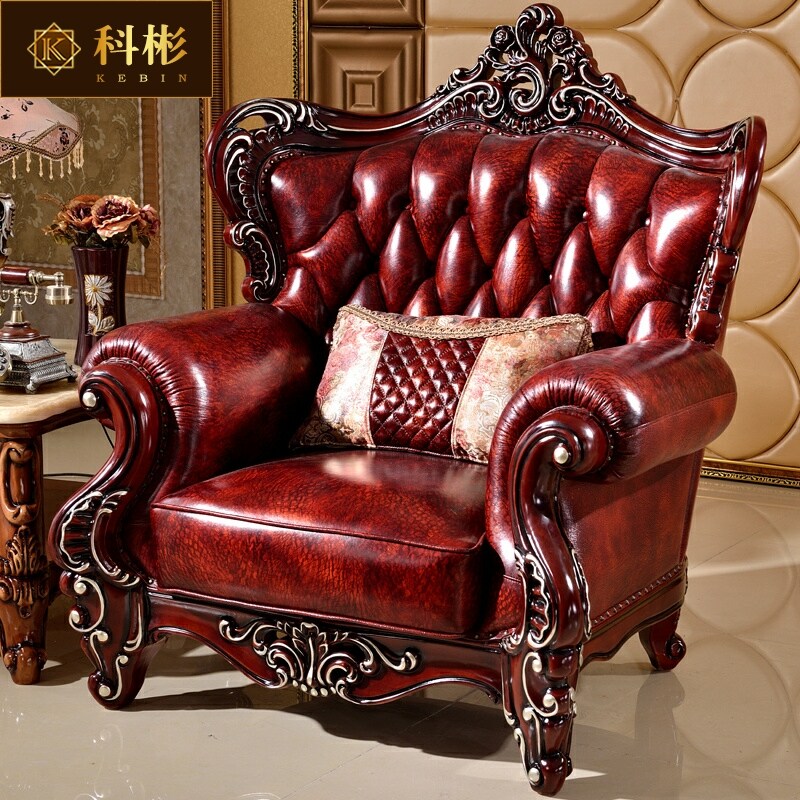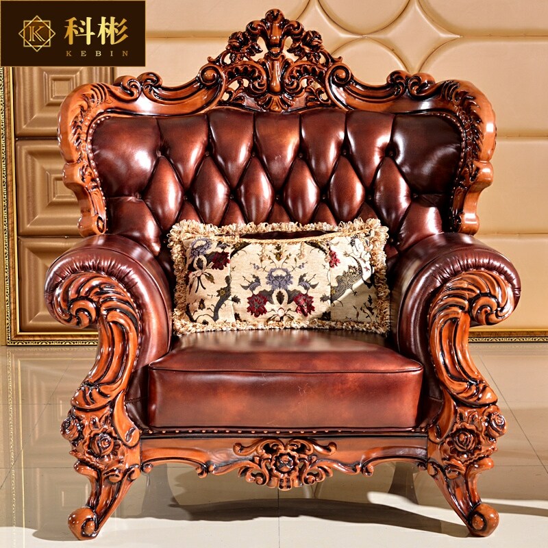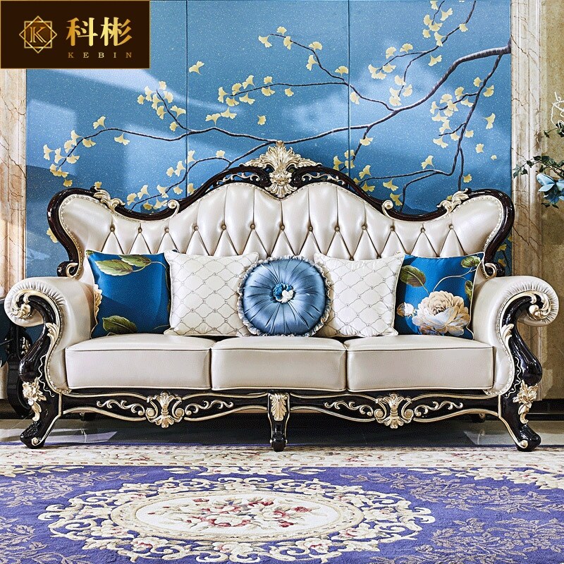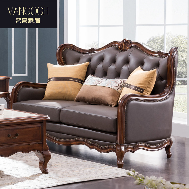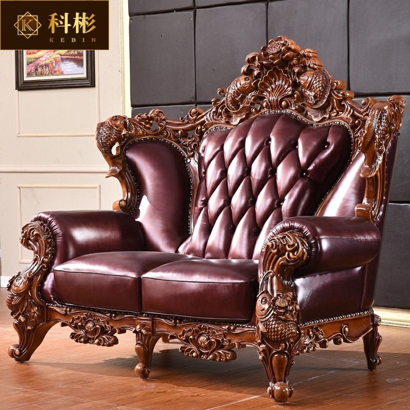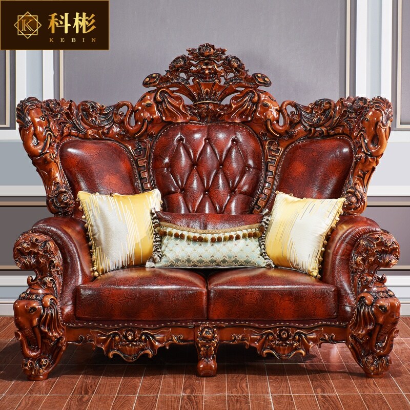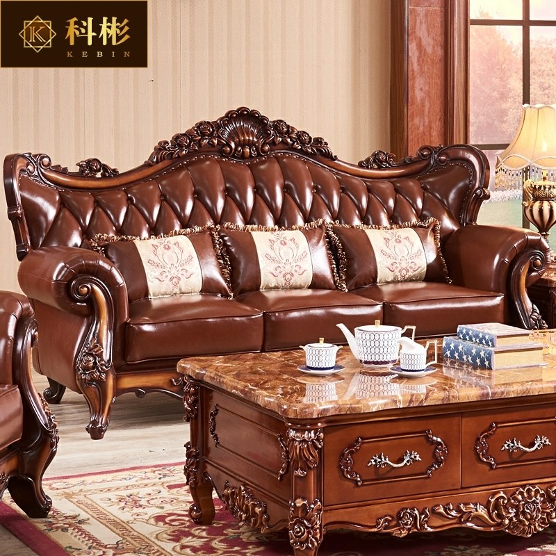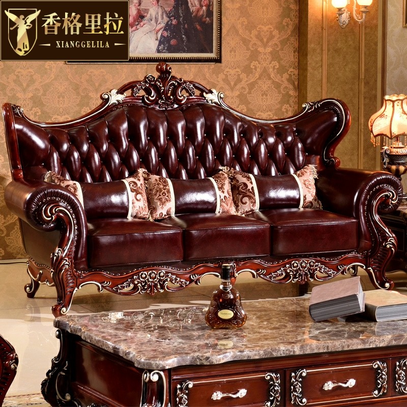 欧式沙发 美式新古典全实木雕花进口真皮沙发1+2+3组合客厅家具