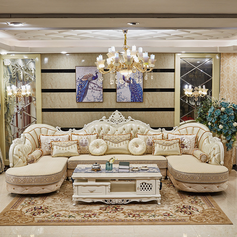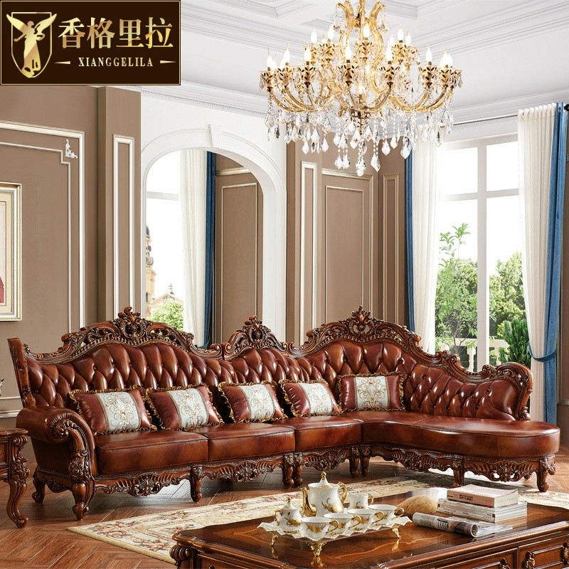 香格里拉 欧式全实木雕花别墅主客厅家用U型头层牛皮真皮沙发组合