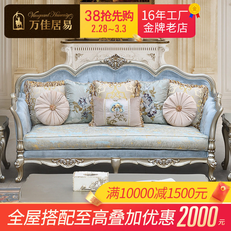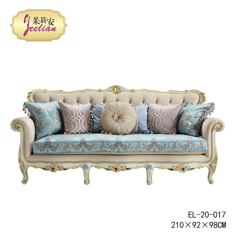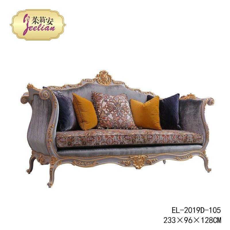 茱莉安欧式客厅法式宫廷浪漫重工雕刻贴金箔三位实木布艺沙发组合