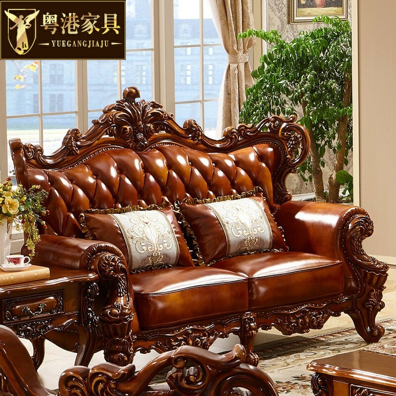 欧式真皮沙发 美式别墅客厅进口头层牛皮1234组合实木雕花U形沙发