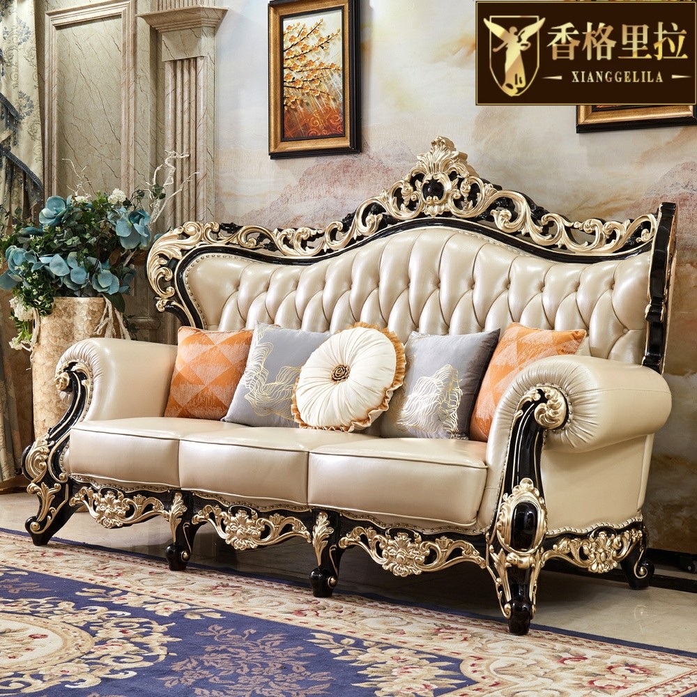 欧式实木沙发 美式客厅别墅奢华实木雕花描金银黑檀1234真皮沙发