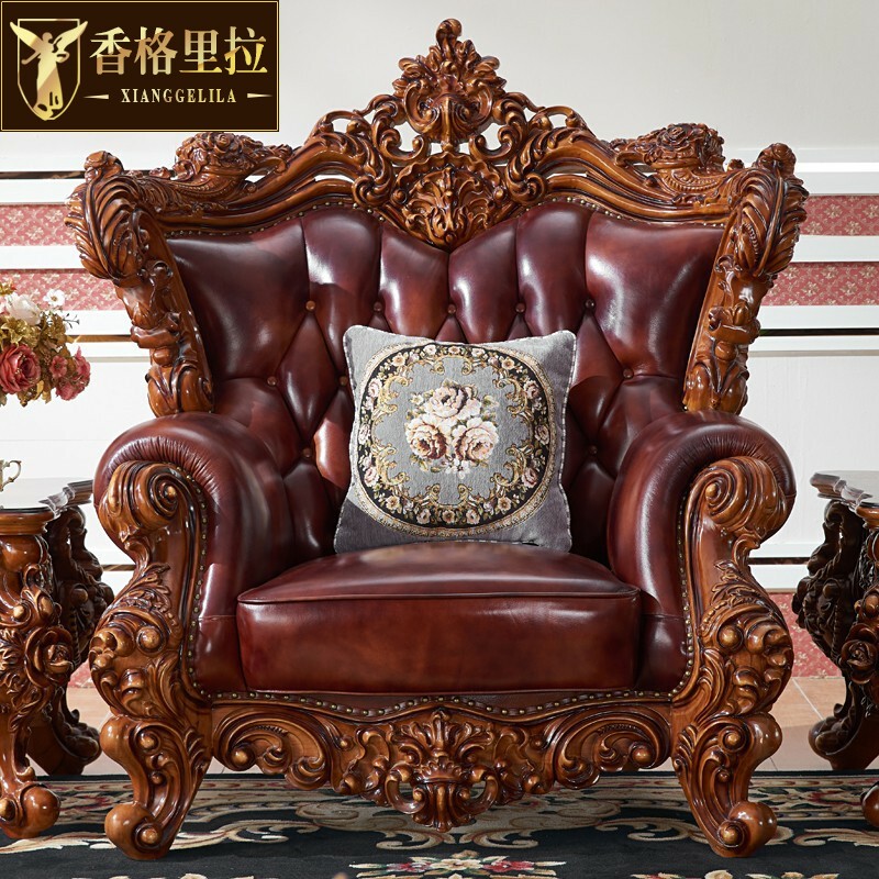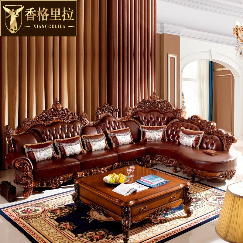 欧式头层真皮沙发全实木橡木雕花牛皮奢华别墅型客厅转角客厅组合