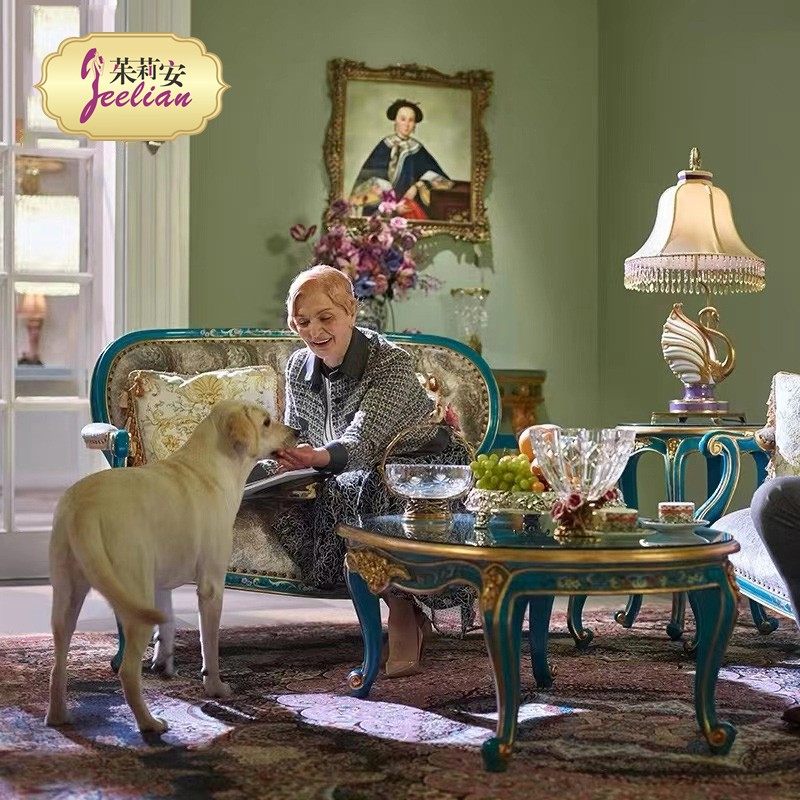 茱莉安家居法式欧式实木雕刻羽绒水蓝色贴金箔别墅样板间组合沙发