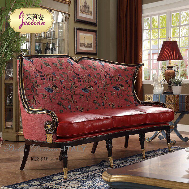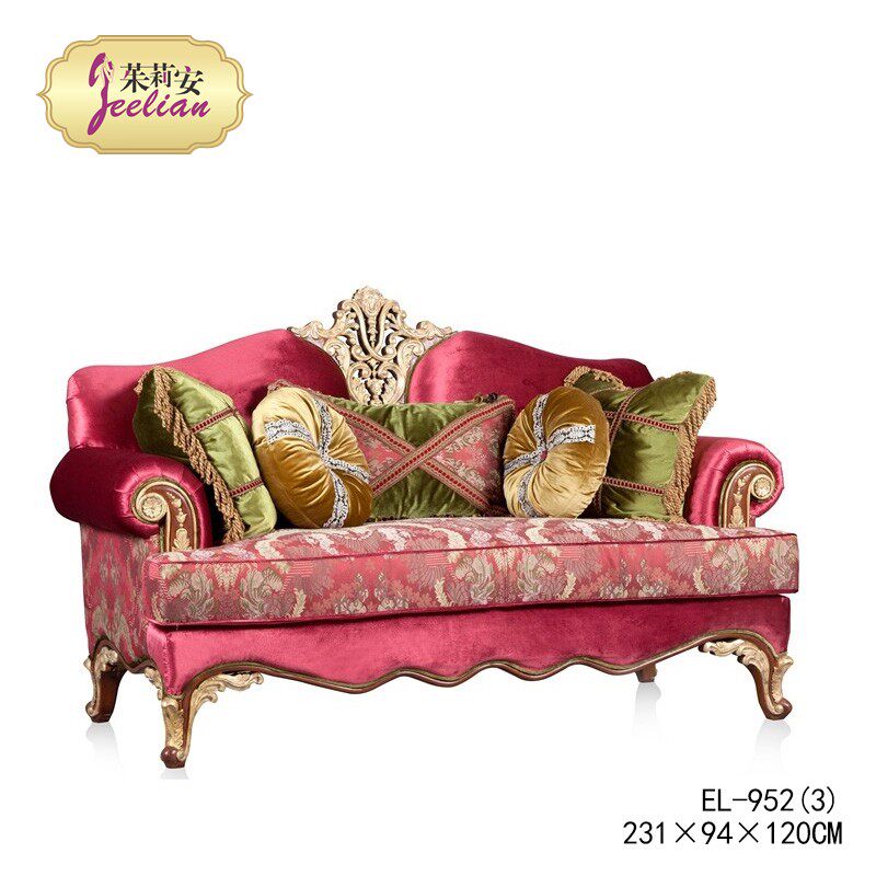 茱莉安法式宫廷实木欧式家具红色别墅红绿撞色艺术布三位沙发组合
