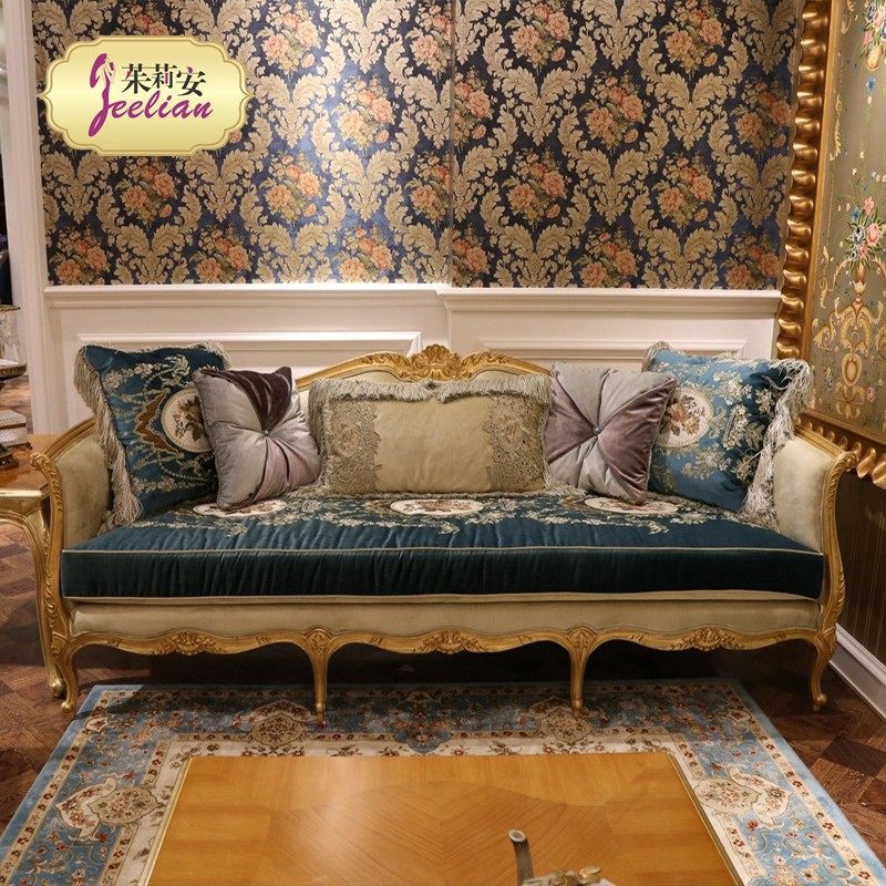 茱莉安奢华法式宫廷风实木雕刻贴金箔刺绣布艺欧式家用沙发组合
