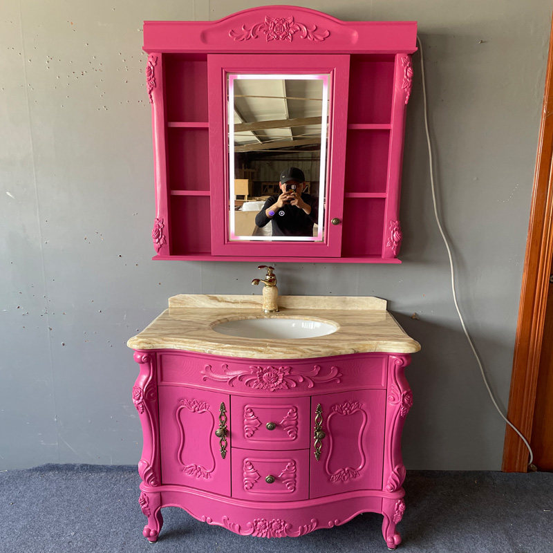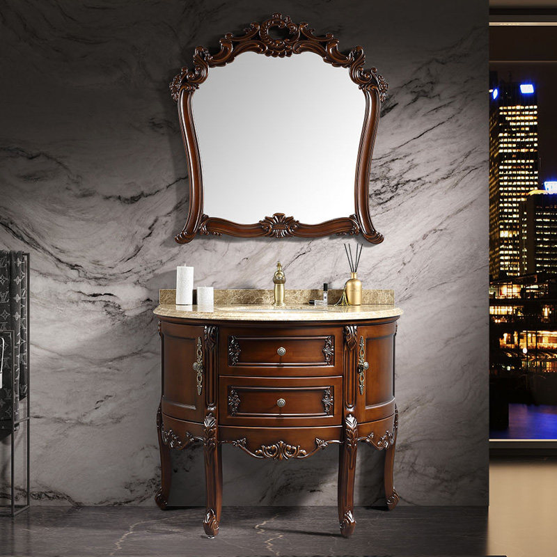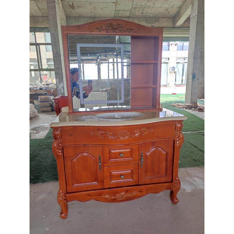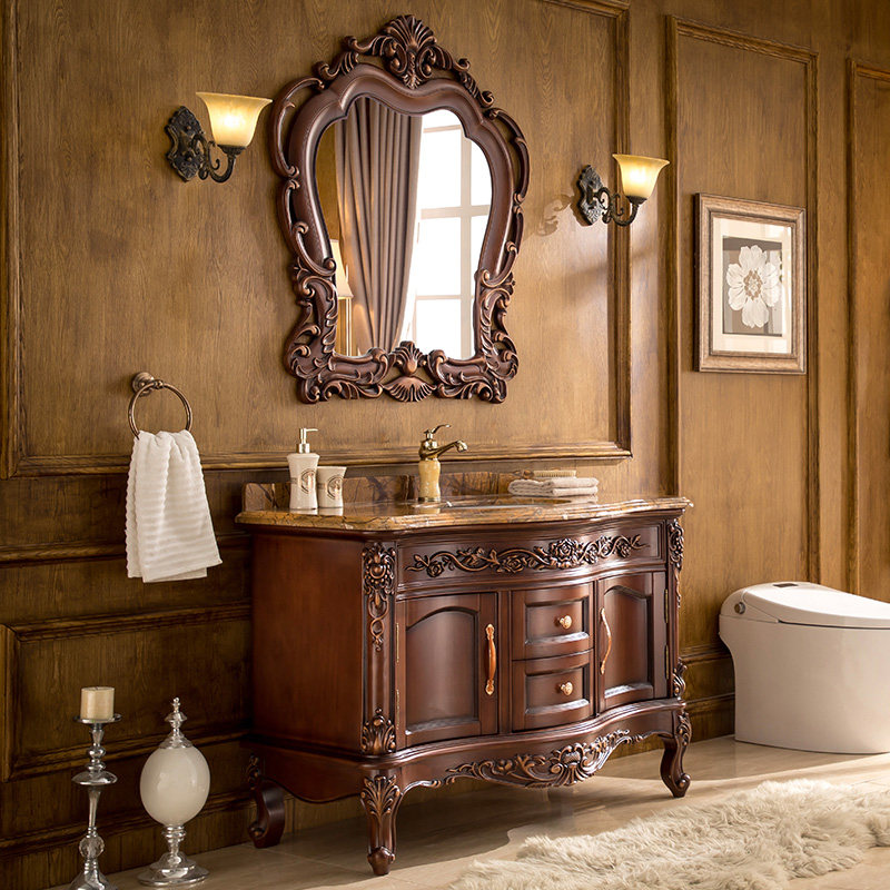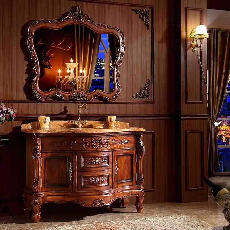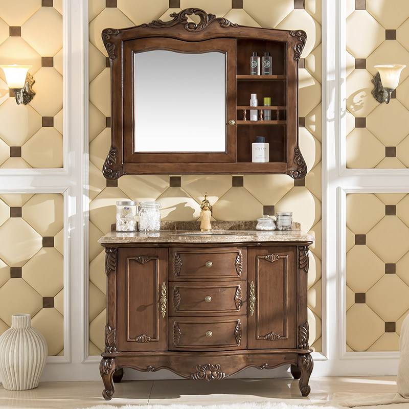 欧式实木落地浴室柜 大理石台面卫浴柜 红橡木雕花洗脸盆柜洗漱台