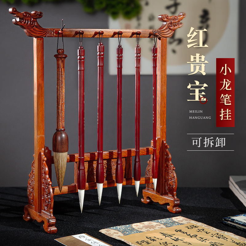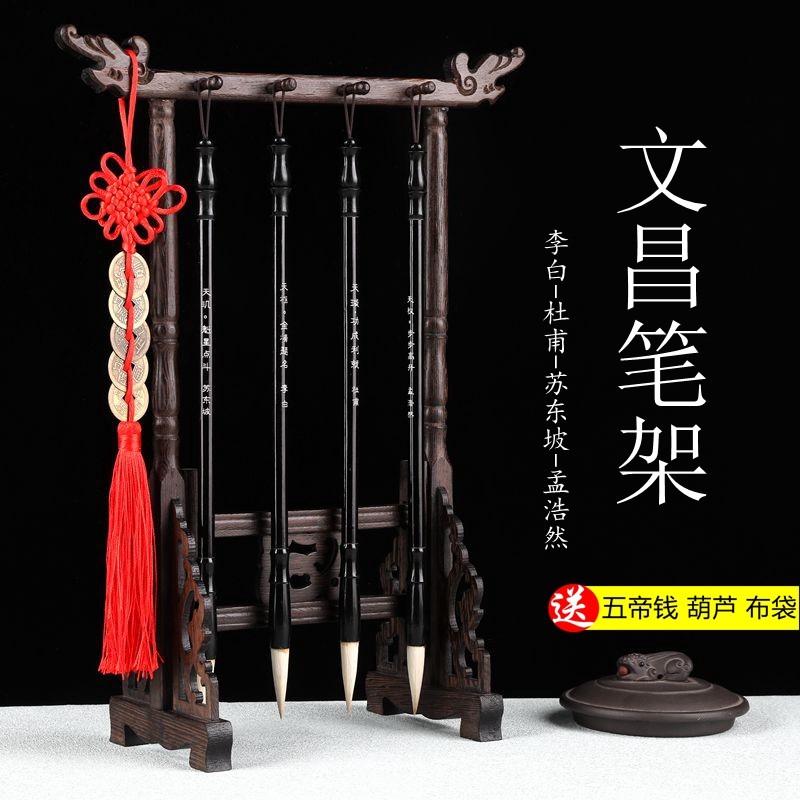 毛笔挂笔架实木学生摆件经典男孩套装红檀实木刻诗人文昌毛笔4支