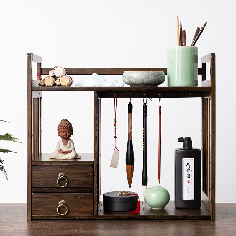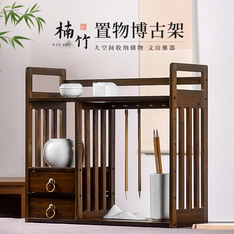 楠竹博古架实木中式 三层抽屉毛笔笔挂 文房四宝摆件 架子置物架